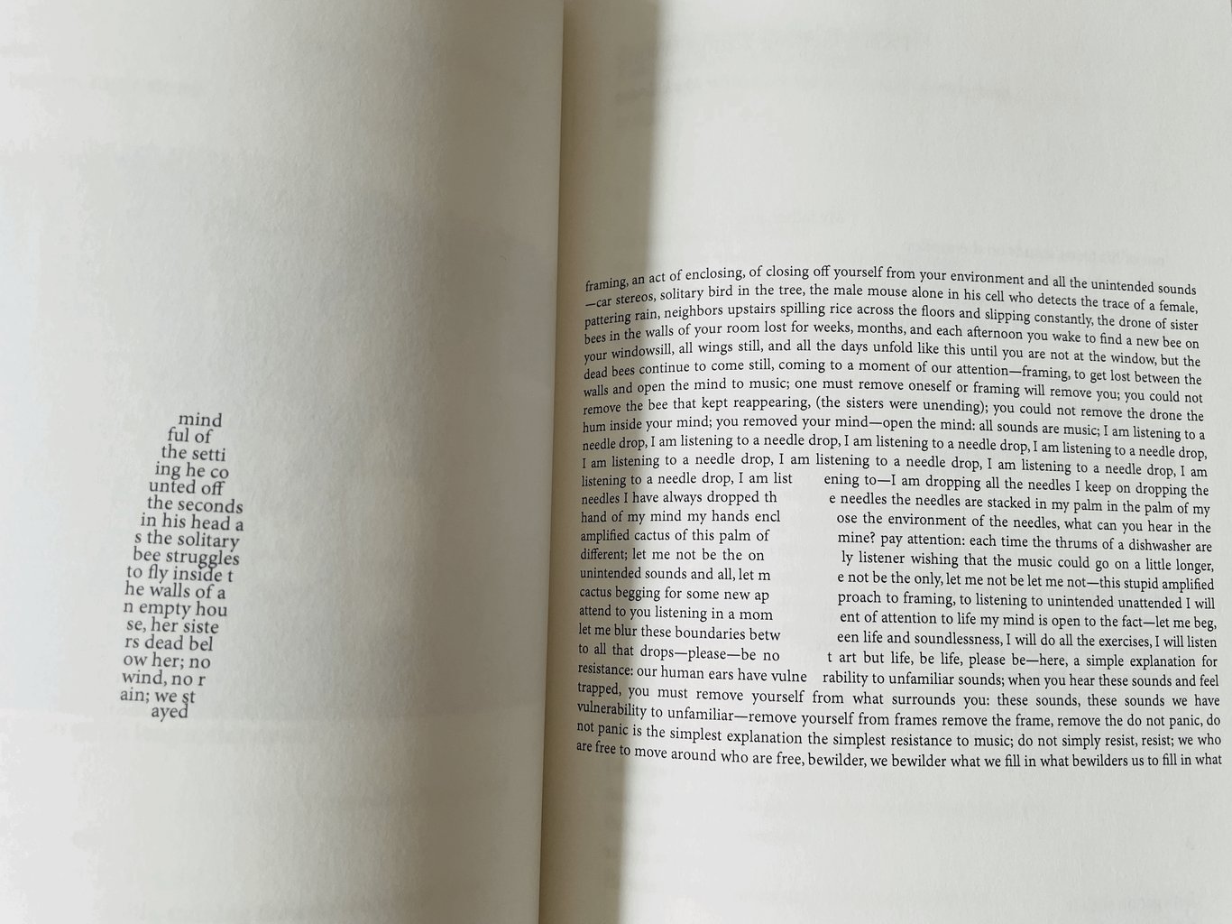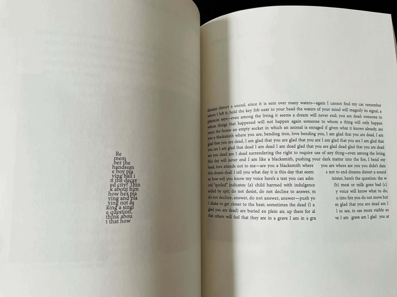 這本詩集用了一種極端的拼貼、剪切形式,在我看來是表達了兄弟突然自殺的突兀,以至於對於很多很多小片的詩閱讀起來非常困難,甚至讓我想到了早年間用微軟word軟件玩排列英文字母的遊戲。