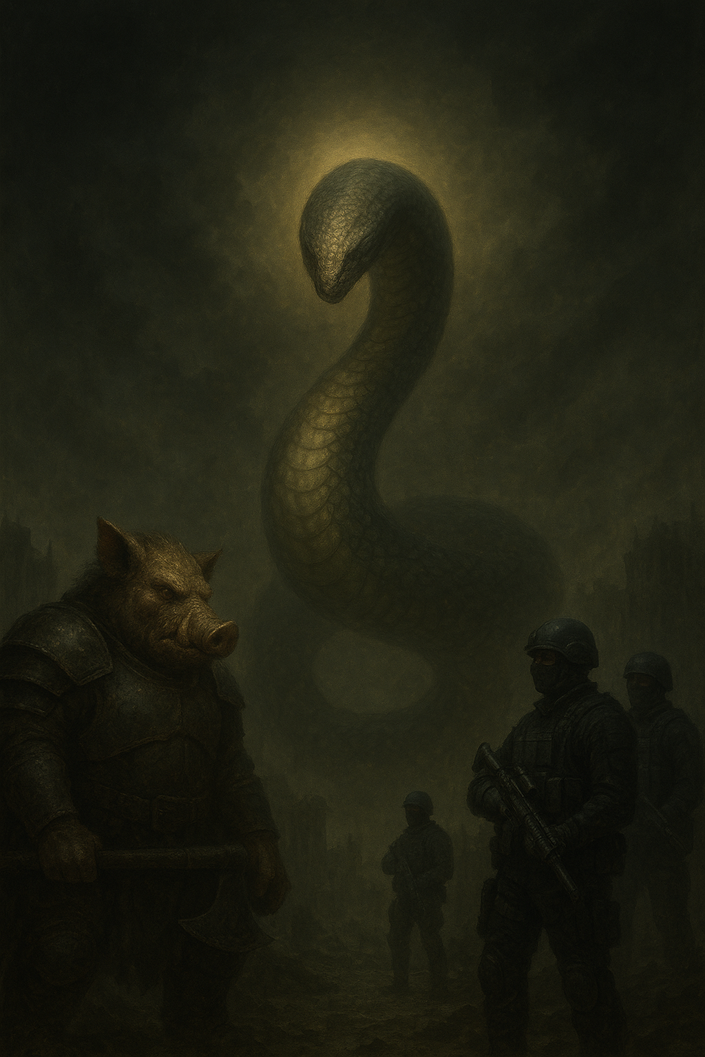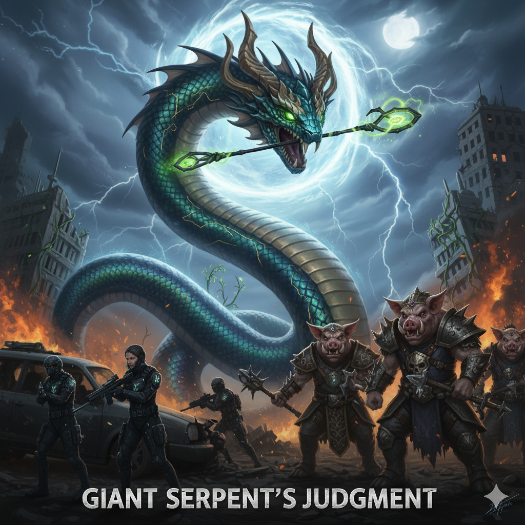 這下真的應證了過去那些妖怪肆虐都是因豬人而起的傳言,眼看已經錯過了最好的動手時機,硬拼也絕對沒辦法解決他們,正當苦無對策的我們,突然外頭一陣青光閃現,蛇精降臨在宴會地點旁邊的廣場上,一雙大眼從窗外望了進來,豬人們從剛才囂張跋扈的樣子,瞬間臉色鐵青。我跟其他夥伴們馬上拉著身邊最近的政府官員,跑向後面廚房,與此同時所有豬人守衛抄起腰間的槍往窗外一陣掃射,但隨之而來的是豬人守衛們的哀號聲,原來是蛇精口中噴出毒液,不只守衛,連宴會廳的外牆都溶了一大半,這時豬人頭目跟貴族完全暴露在蛇精面前,紛紛跪下求饒。
