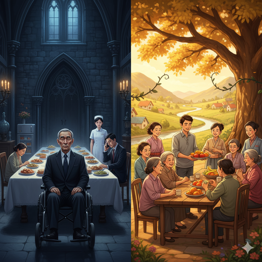 然而,他的內在卻是一片荒蕪。中風之後,他內心的偏執與猜疑像野草般瘋長,吞噬了他僅剩的溫情。他坐在特製的電動輪椅上,眼神如鷹,巡視著空蕩的豪宅。他堅信自己半癱的身體,是妻子「剋」的。這份毒藥般的懷疑啃噬著他的心,讓他將所有親近都拒之門外。他寧可花錢聘請一位印尼看護來照料日常起居,再另外聘請一位台籍助理處理瑣事,也不讓妻子碰他任何東西。他的用餐區不是餐桌,而是辦公室,食材與冰箱都與妻子完全分開,妻子更被嚴禁碰觸他的任何餐點。