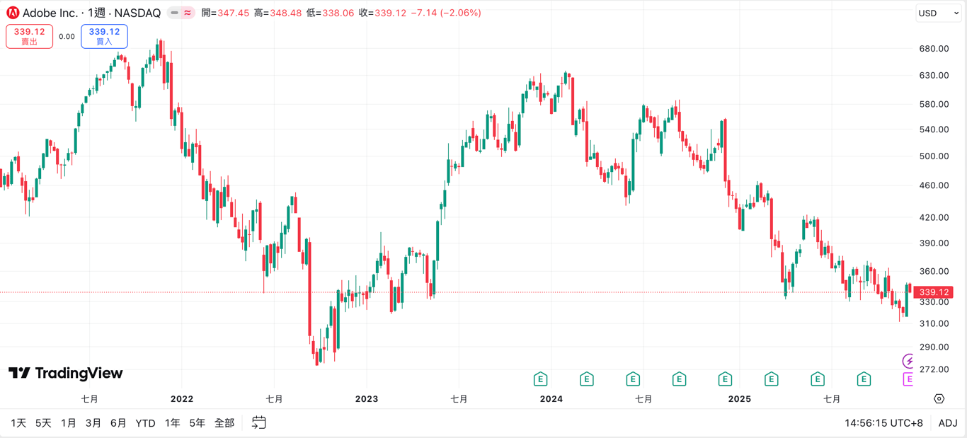 接下來,我們先用數據說話,先看一組最基礎的數據。很多人評價一家公司,就看股價漲沒漲。 Adobe的股價表現確實不算亮眼,兩人年股價下跌了50%,已經腰斬。現在價格在340美元左右徘徊。