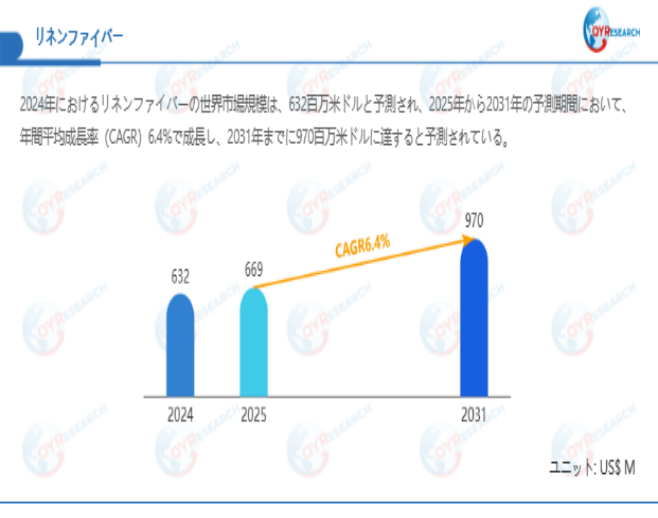 QYResearchが最新発表した「リネンファイバー―グローバル市場シェアとランキング、全体の売上と需要予測、2026~2032」市場調査報告書によると、世界リネンファイバー市場規模は2024年の約632百万米ドルから2025年には669百万米ドルへ着実に成長し、予測期間中に6.4%の複合年間成長率(CAGR)で拡大を続け、2031年には970百万米ドルに達する見込みである。