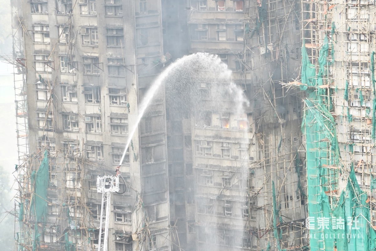 宏福苑大火燒逾 16 小時,直至今早七時,各大廈火勢才見開始受控,消防繼續動用多條鋼梯灌救,其中宏盛閣、宏泰閣有部分外牆已燒至熏黑,安裝於竹棚的保護網被燒至變形;至於火勢最嚴重的宏道閣,記者分別從大埔公路、廣福邨觀察,全棟大廈外牆均已焚黑,甚至有棚架倒塌至地面。現場另有零星單位湧現火光,廣福公園外的一段大埔公路,有懷疑被燒焦的鐵皮飛脫到路上。
