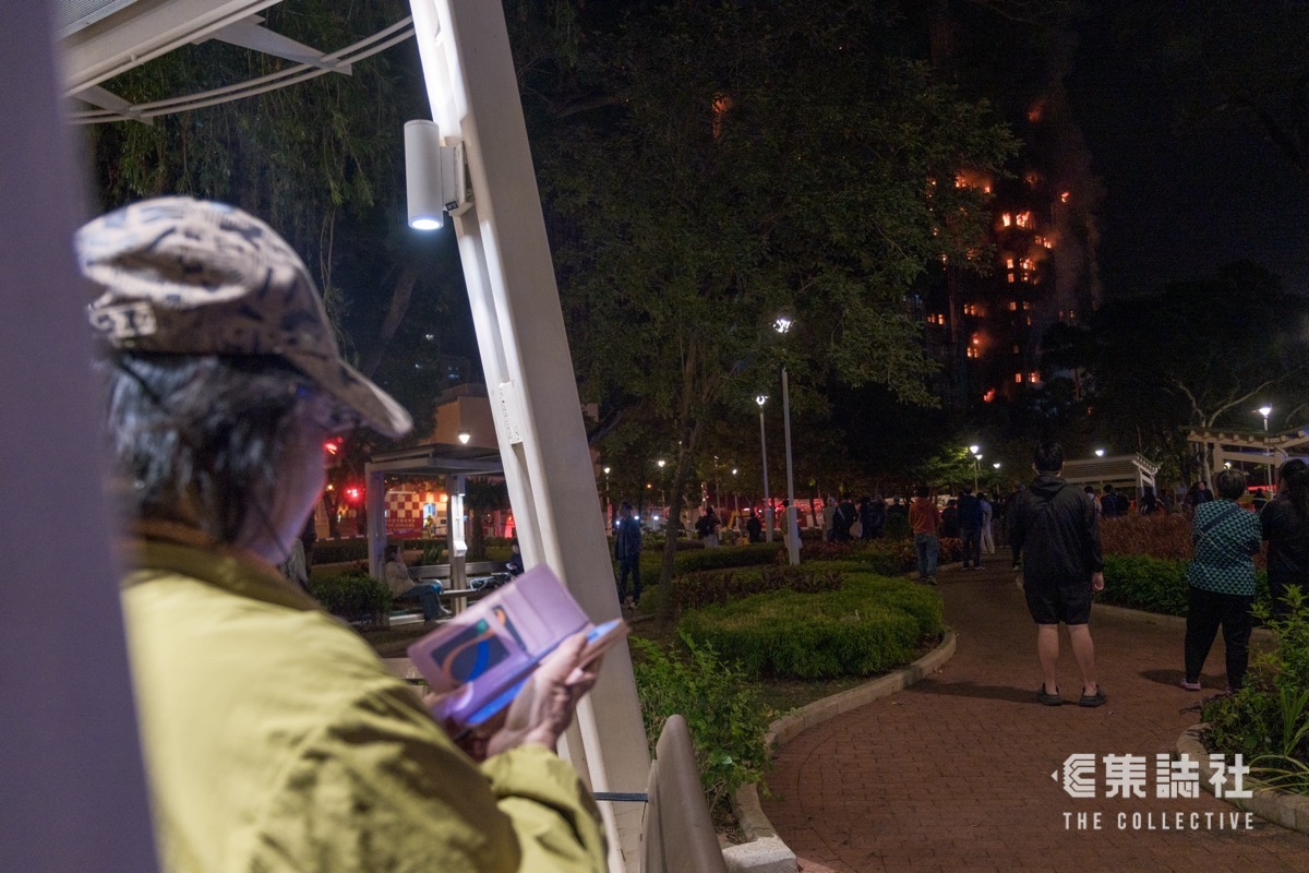 除了李女士,昨晚也有不少居民坐在廣福公園遙望火勢。入夜天氣寒冷,居於宏泰閣的一手業主羅女士、黃女士,分別住在 22 、27 樓,均是獨居的二人,自起火後趕回屋苑,因「不心息」而堅持在附近觀看。