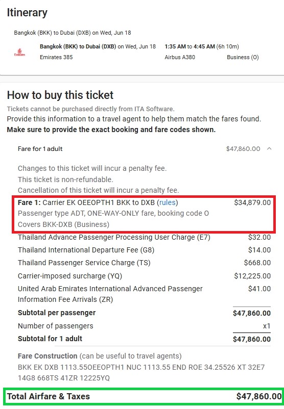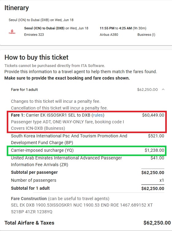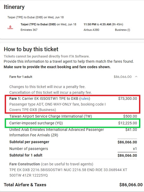 這張是阿聯酋航空台北桃園到杜拜的單程商務艙票,子艙等為商務艙第二階的I艙,可以看到光是機票原價就要7萬多元,再加上超高額燃油附加費(綠框,12225元),整張機票就要新台幣 86066 元了。😱