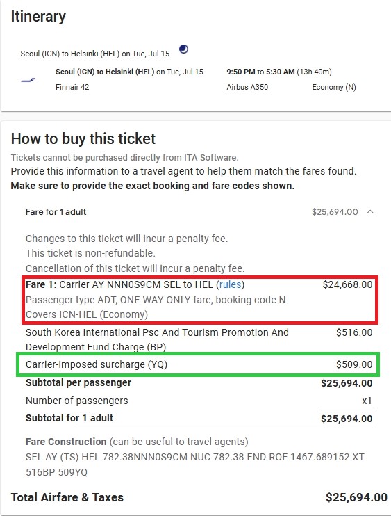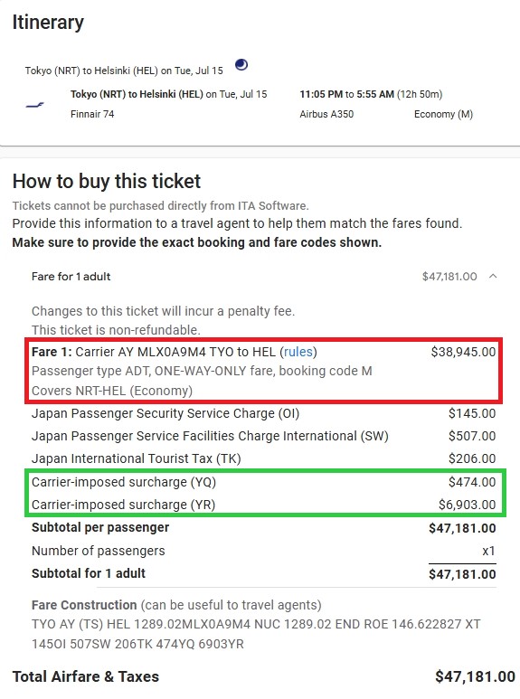 從東京成田到芬蘭赫爾辛基的機型為 A350-900,子艙等為經濟艙中較高的 M 艙,所以單程經濟艙就要高貴的台幣 47181 元了。可以看到紅框中,機票原價就快要4萬元,而燃油附加費就要驚人的台幣 7377 元(綠框),整體票價就是貴!