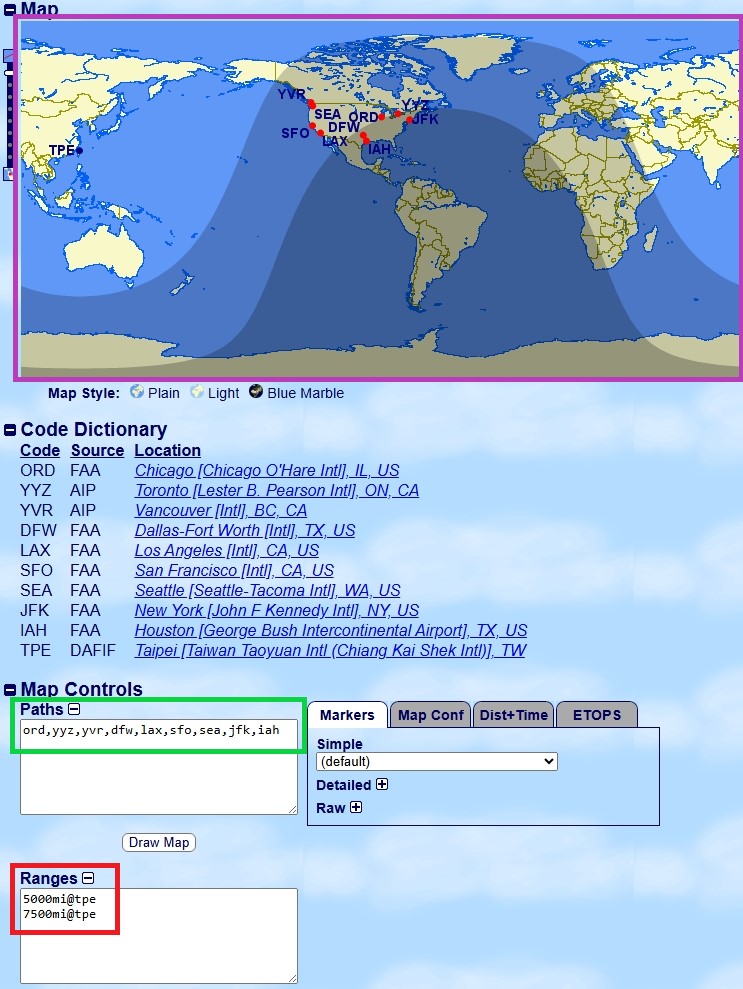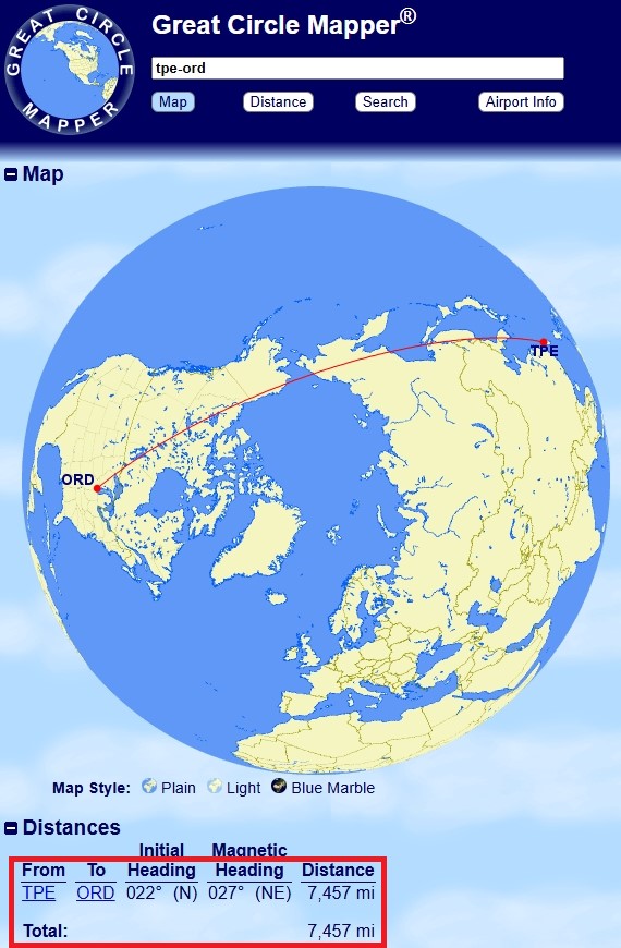 我們可以看到,芝加哥(ORD)非常貼近 7500 英哩範圍的線,這很有趣~~~