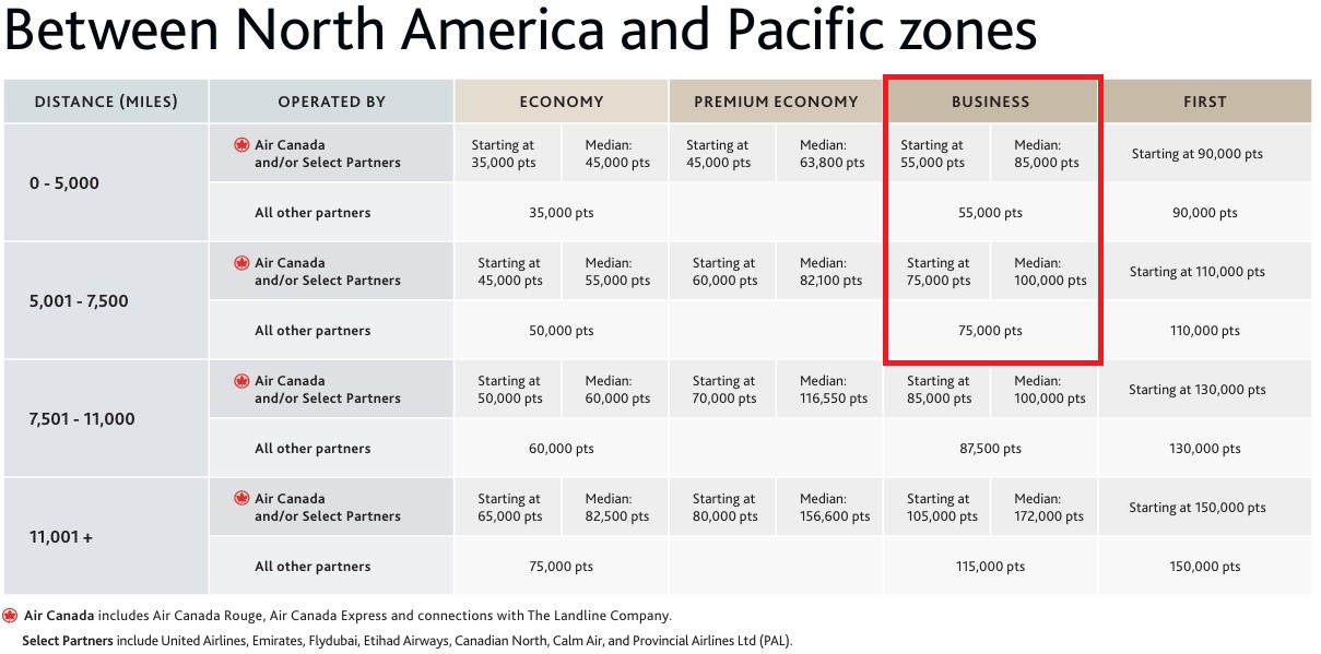 我們先來看看加拿大航空的兌換表(中北美-亞太大洋洲區間),因為加航與長榮同屬星空聯盟,所以我們可以用加航里程兌換長榮航空的機票,兌換 5000 英里內的單程商務艙(長榮的皇璽桂冠艙)需要 55K 的里程,而 5001-7500 英里區間的單程商務艙需 75K 里程。