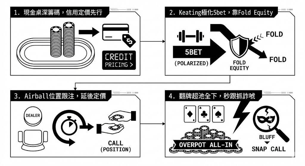 Keating的混沌施壓在許多對手面前能換取過度棄牌,長期累積無攤牌EV;但當對手願意把詐唬占比算進去,並在正確結構提升防守頻率,他的最大動作就會失去嚇阻力。