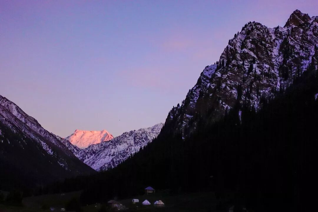 卡拉科尔有数条中亚乃至世界最美的山谷徒步路线。其中,最受旅行者青睐的是阿尔金-阿拉善山谷。在这个季节,山路两旁的绿草已长出新芽,无数不知名的野花遍布其间。在海拔较低的地带,生长着郁郁葱葱的白桦林、钻天杨和黄芦木。行至海拔高处,山上便只剩高耸笔挺的松树。在背阴的山坡上,无穷无尽的松树林黑压压一片,看的人脊背发凉。