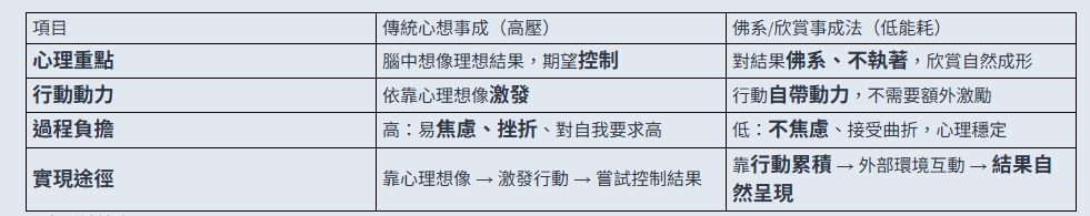 很多人談心想事成,會強調在腦中**「預演成功」**,感受喜悅來激發行動。這或許有效,但往往帶來極高的心理負擔:焦慮、挫折、對結果的過度執著。
