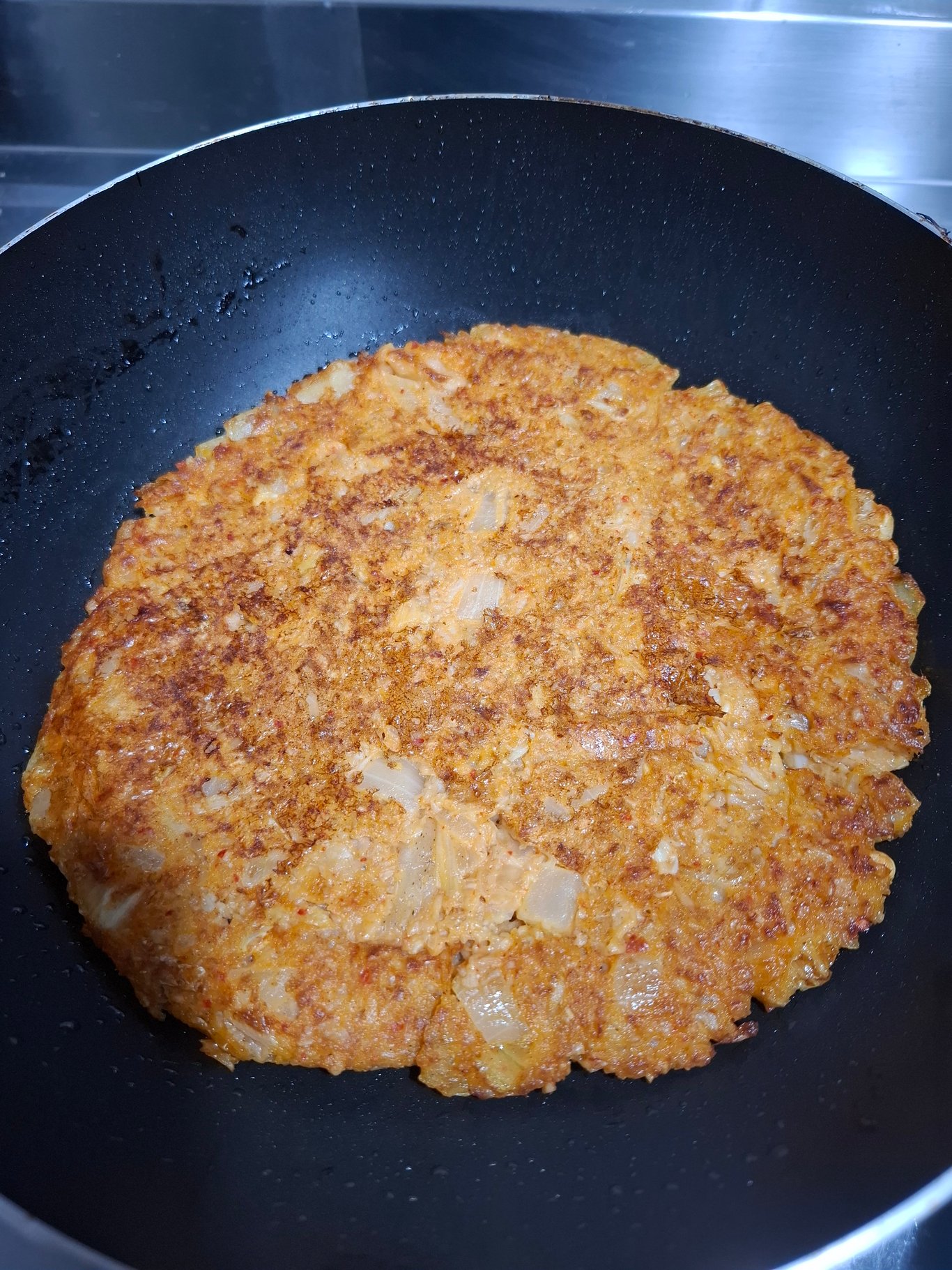 下次是不是要再加一點燕麥粉增加黏稠感?不然感覺洋蔥和金針菇和泡菜都會出水,整體煎起來很容易散開呢…