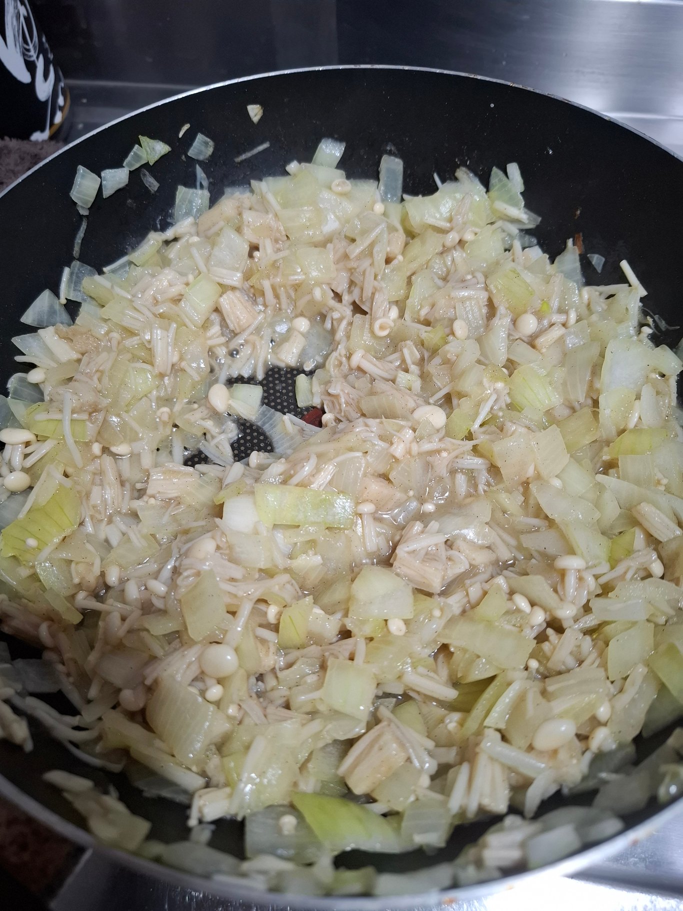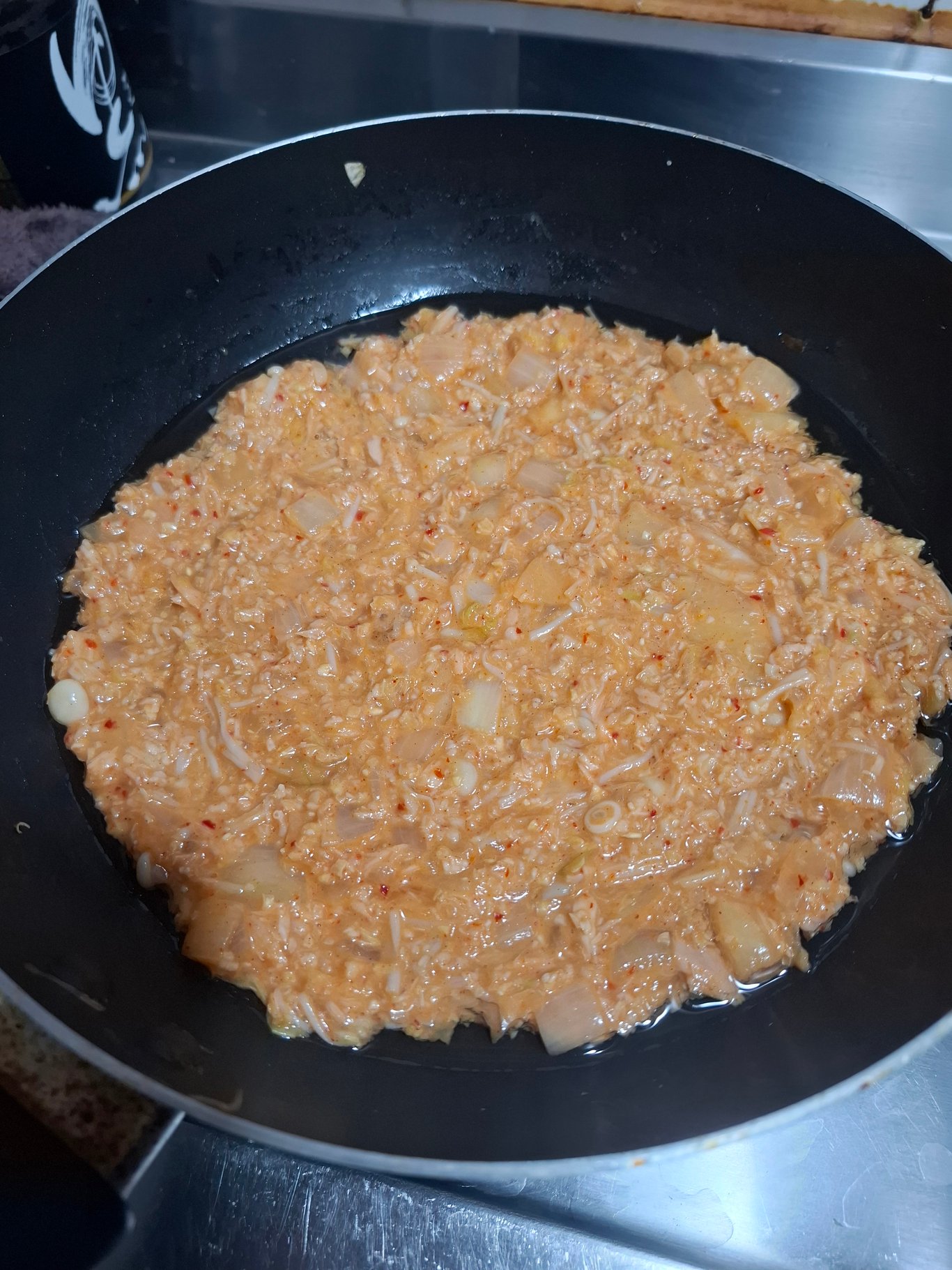 一顆洋蔥切丁,金針菇切小段下去炒,適量加點胡椒鹽調味,放到一旁放涼。燕麥麩皮加適量熱水泡開,等待麩皮和放涼的時候切泡菜和準備鮪魚罐頭,再來就是拿一個大一點的盆子把全部食材加入,打三顆雞蛋攪拌均勻,適量再加一點胡椒鹽。攪拌完成之後就可以下鍋煎了,我覺得很好吃!韓式泡菜加鮪魚真的非常美味啊!