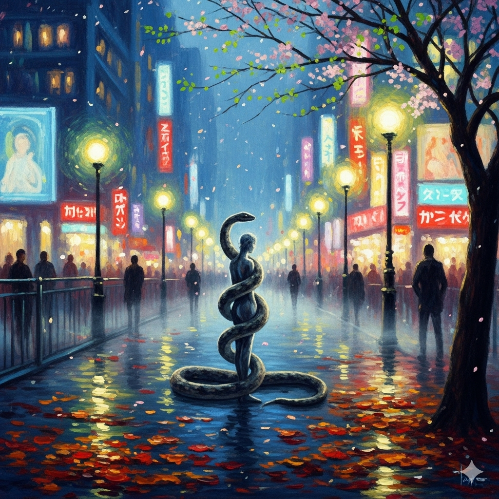 当我走近端详这片神秘的花海,夜色正式向我敞开,灯光、月光和旁人的眼光都汇聚而稀释于此。我感到寒冷,一条蛇抱住了我的身体,将我瘦的灵魂吃的一干二净。