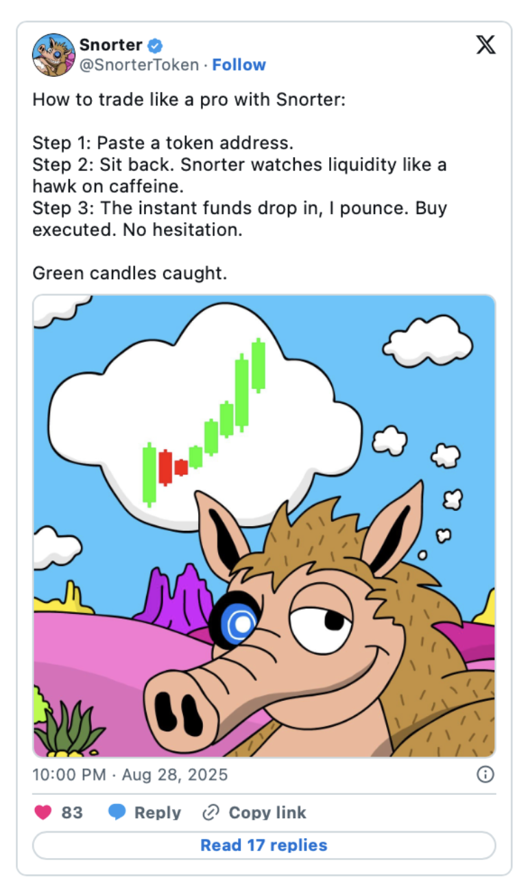 這種 Meme 特質為 Snorter 增添了另一層需求 —— 來自那些不僅把它視為嚴肅工具,更是單純享受持有一枚「頂級腦洞 Meme 代幣」的交易者。