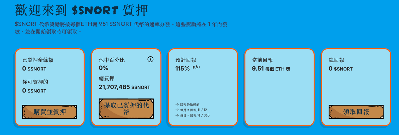 質押協議:SNORT 代幣驅動的質押機制可為用戶提供最高 115% 動態 APY 的被動收益。