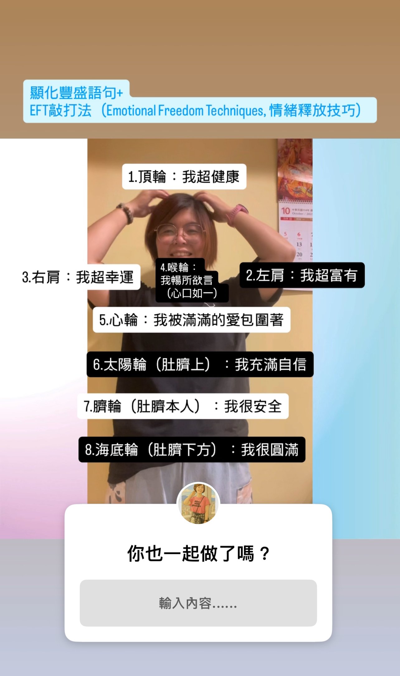 回到家以後,我自己也錄了一小段關於EFT敲打法影片,放在自己私人的限動,分享給我的朋友,我覺得對我來講,可以把這些原本覺得自己很不錯的東西,把它分享出來,這件事本身其實對我來講是一個很大的突破!