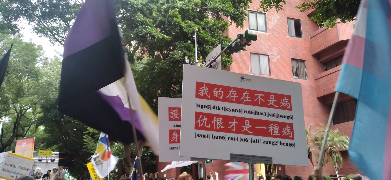 在閒逛和等候的人潮裡,很容易可以碰得上來自世界各地的人,單是亞洲面孔的,已經可以是來自日本、韓國、泰國、馬來西亞、菲律賓等地,各式的性別旗熾以外,飄揚的國旗和標語的書寫語言,同樣多元。偶爾傳來三兩句粵語,雖然逕自參與的自己,並沒有跟任何人相認,但心坎裡也會明白,對方也是同樣來自香港的。有讀到《獨媒》、《集誌社》等有關台灣驕傲遊行的報導的話,都應該會知道,本年在 47 人案服刑完畢的岑子杰,亦是遊行的坐上客,自己也跟對方擦身而過好幾次。而遊行官方在出發期間,亦有提及到「G點電視」這個在香港有較長歷史的性別團體的名字,自己在襦動著的遊行隊伍裡,亦有見到有參加者舉著的標語牌下,出現著粵拼。