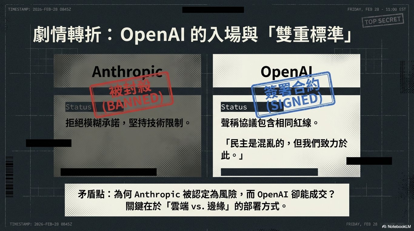 OpenAI 參與的關鍵轉變: OpenAI 在 Anthropic 與軍方僵持不下時介入,定位自己為**「能與政府深度合作且同時保有底線」的愛國 Lab。[4] 他們主張通過「雲端部署」與「安全人員參與(personnel in the loop)」**的架構,解決了 Anthropic 認為無法達成技術保障的難題,從而迅速填補了 Anthropic 被排擠後的市場真空。[4]