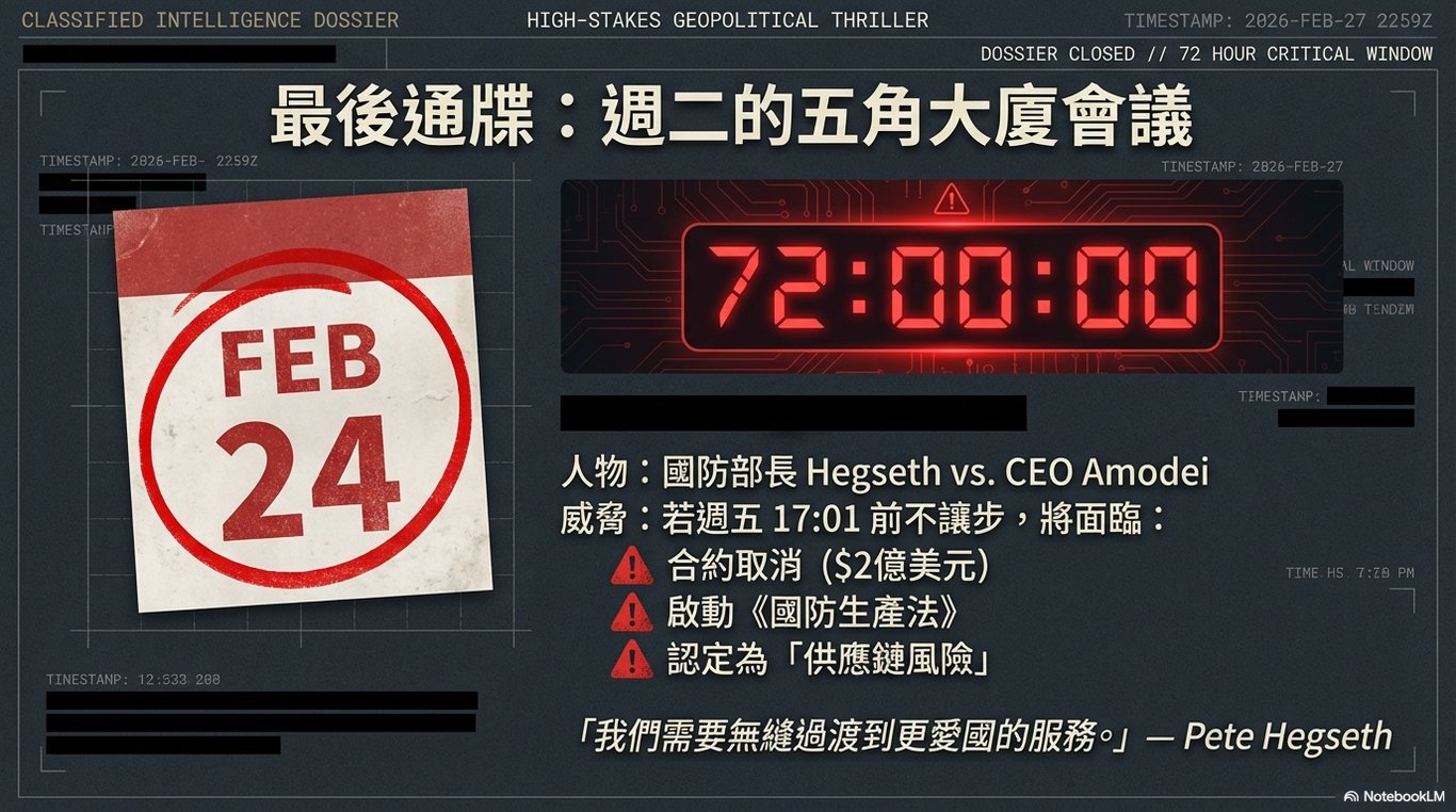 最終提案:五角大廈官員於週三深夜向 Anthropic 送出「最後且最終提案(best and final offer)」,要求該公司在期限前移除 AI 安全護欄。[1]