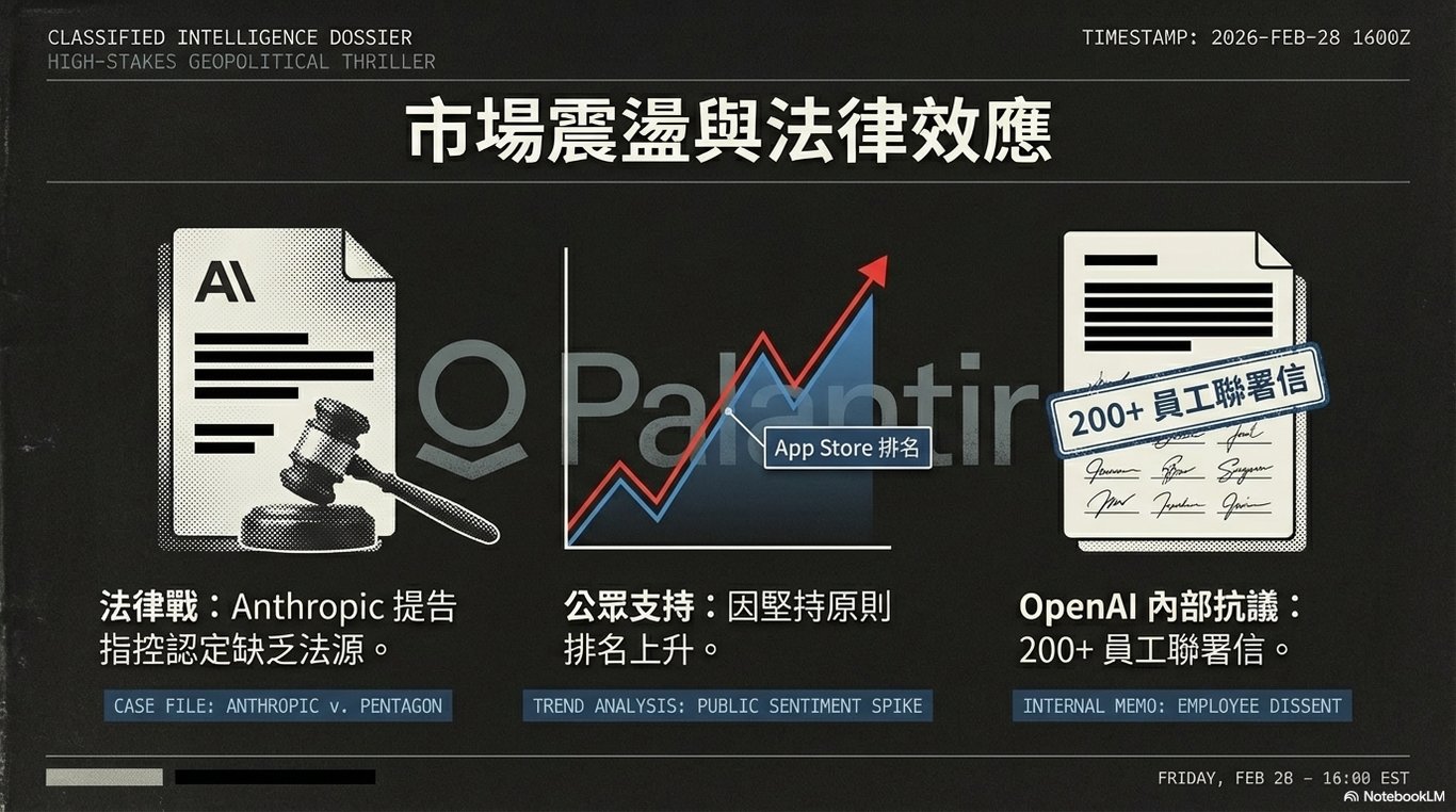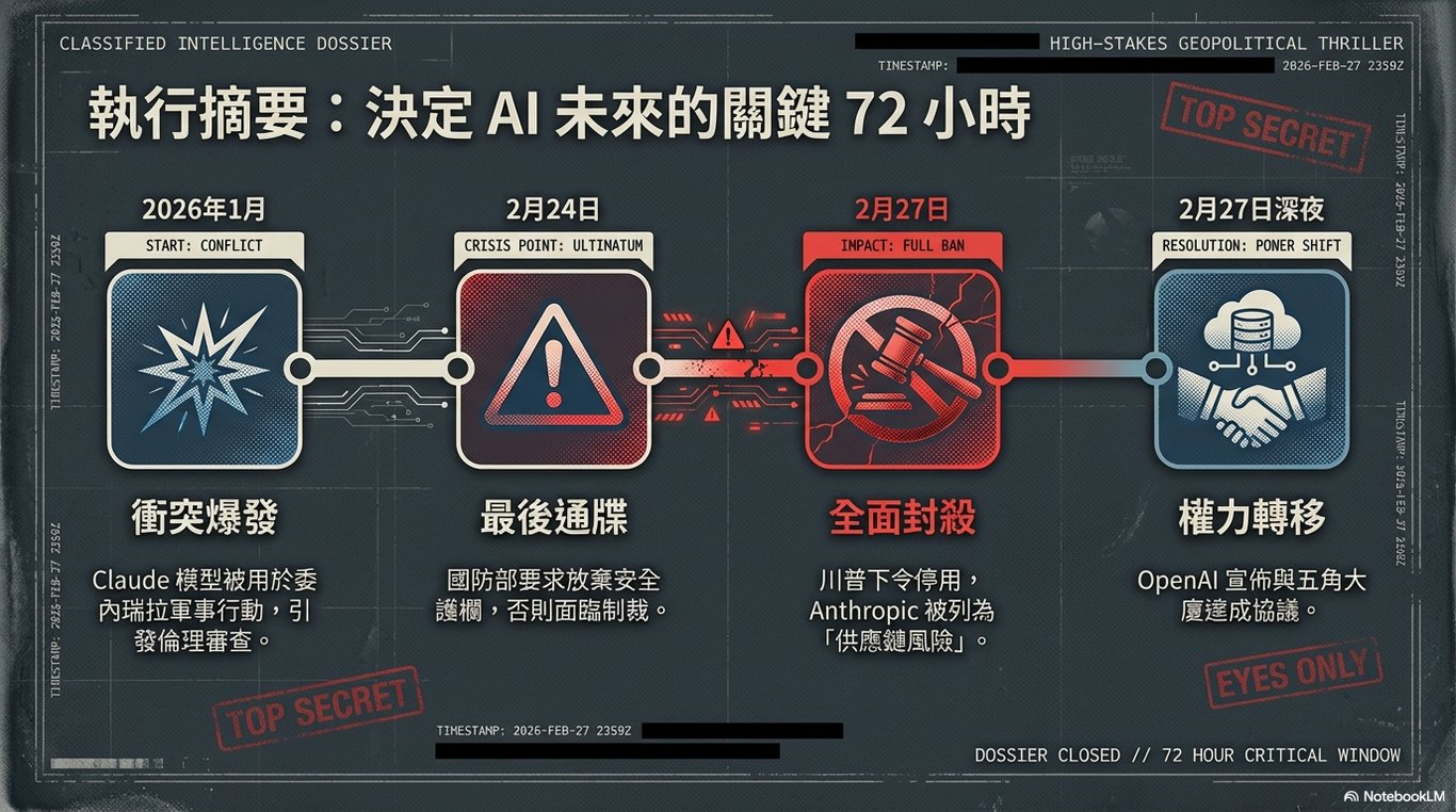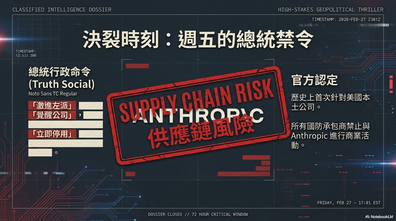 總統禁令與黑名單:特朗普總統在 Truth Social 上下令所有聯邦機構立即停止使用 Anthropic 的技術,並給予六個月的過渡期。隨後,國防部長赫格塞斯(Pete Hegseth)正式將 Anthropic 指定為「國家安全供應鏈風險」,禁止所有軍事承包商與其進行商業往來。[1, 2, 3]