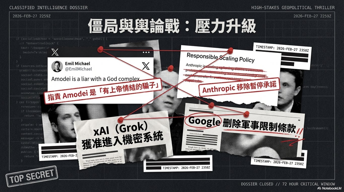OpenAI 介入談判:根據後續報導,OpenAI 與政府於本週三已開始會面討論合作事宜。週四晚間,奧特曼(Sam Altman)向員工發出內部備忘錄,表示正尋求達成一項既能部署於機密系統,又能保留安全底線的協議。[2]