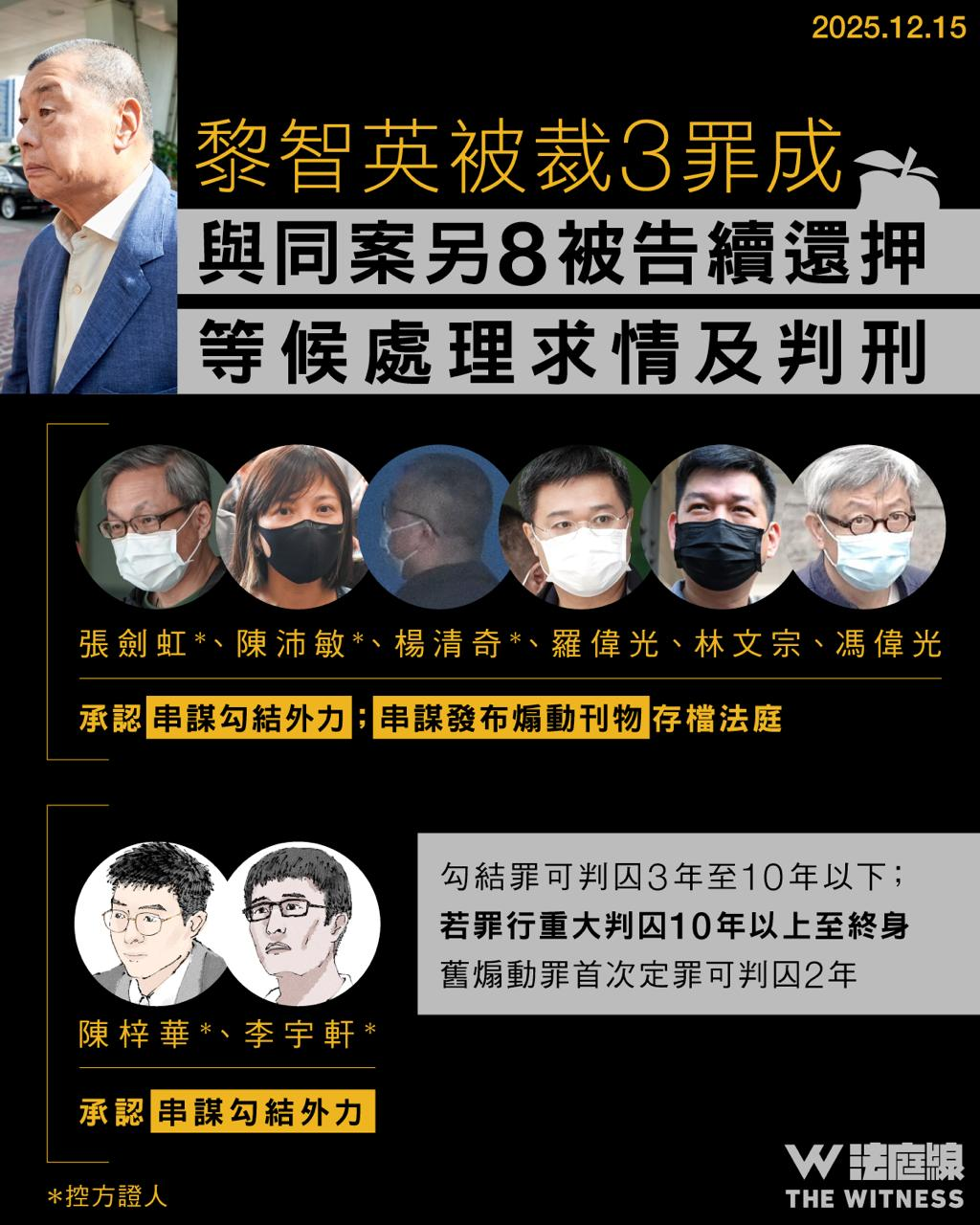 官信納黎智英是涉案串謀的主腦,裁定黎面對的兩項串謀勾結外力、一項串謀發布煽動刊物全部罪成。相關公司亦同樣罪成。官指示於 2026 年 1 月 2 日提交求情書面陳詞,1 月 12 日處理口頭陳詞,預留 4 天,判刑日期盡快公布。