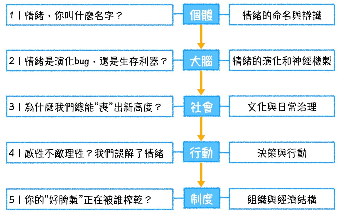 《1 | 情緒,你叫什麼名字?》討論了什麼是情緒、什麼又不是情緒,把「情緒」從口語的「emo膠囊」拆開,提倡用「情緒環」辨析複雜情緒的成份——「精確命名」是情緒管理的起點。