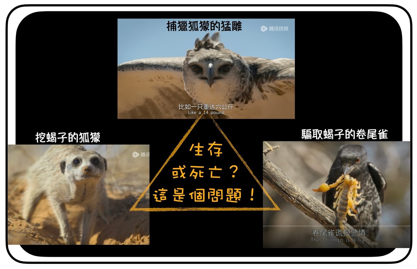 演員有狐獴及其天敵猛雕,但主角是狐獴的鄰居卷尾雀,其銳利的視覺可以發現1.6公里以外的猛雕。狐獴埋頭挖沙尋覓蠍子時,卷尾雀便充當哨兵,以警報聲「通知」猛雕的逼近或離開,讓狐獴在更安全的環境中挖出更多的蠍子。看來,它們是盟友。