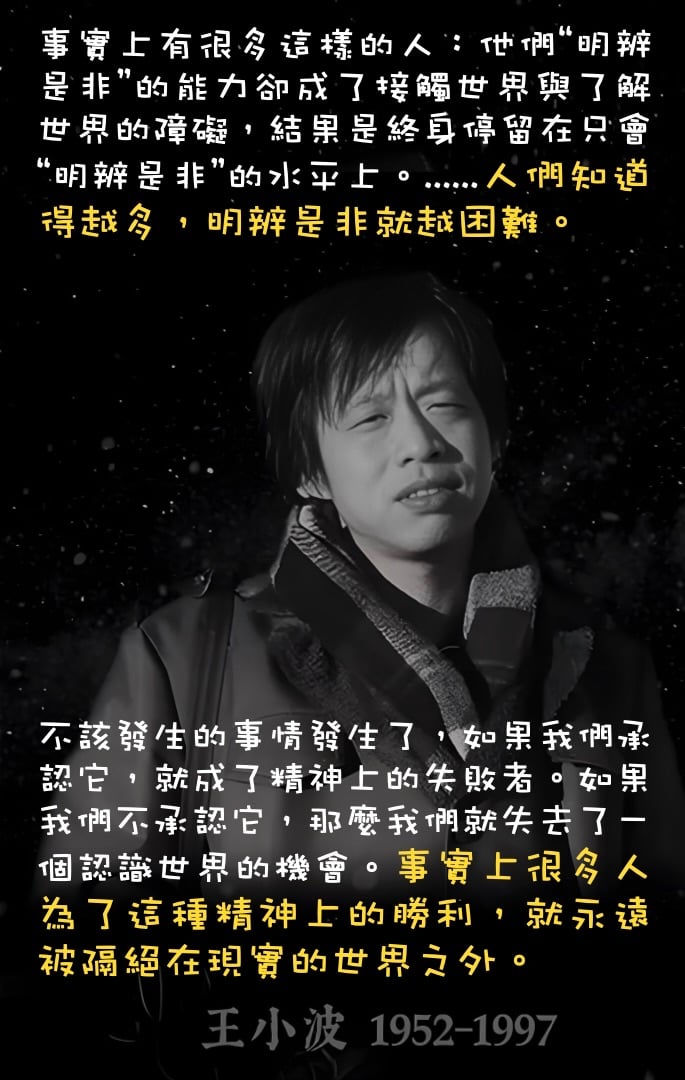 王小波認為,「明辨是非」並非毫無必要,但是「如果以為學會了明辨是非就有了什麼能力,那就大錯特錯了。我們學會了把世上一切事物分成好的和壞的以後,對世界的瞭解還是非常非常可憐的。」