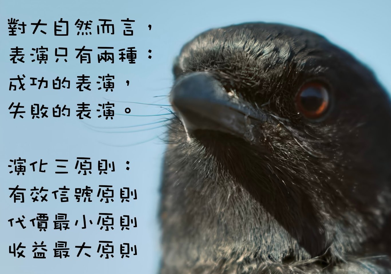對大自然而言,情緒表演只有兩種類型——成功的表演和失敗的表演,唯一的判斷標準就是「生」或「死」,其演化遵循三條原則:有效信號原則、代價最小原則、收益最大原則。