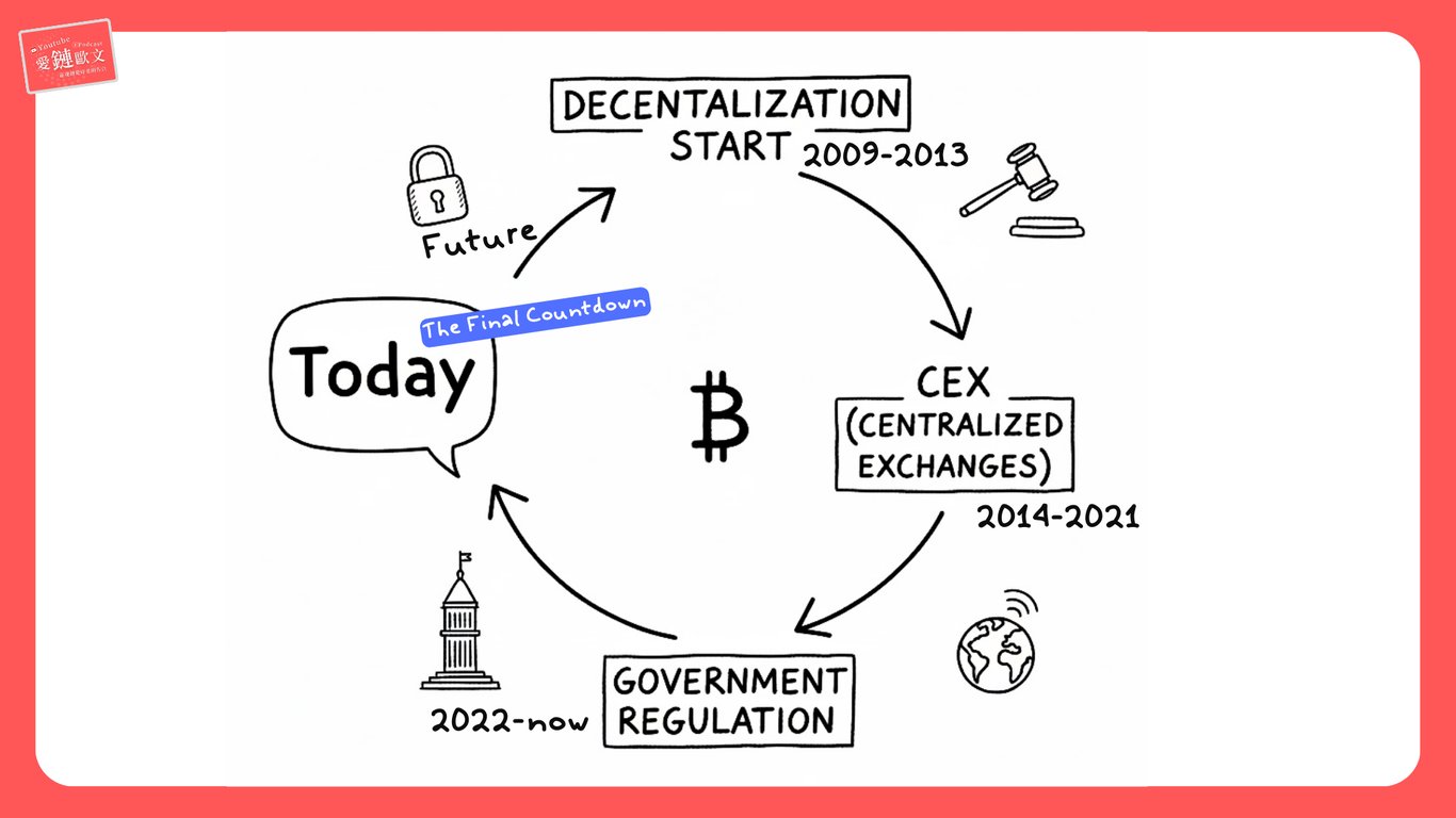 比特幣發展至今 16 年,對資深參與者來說,這不只是幾次的牛熊交替而已,更是一場關於「人類共識」的信任移轉。如果拉高視角來看,這是一個完整的輪迴路徑:我們從去中心化的起點出發,中途為了便利性,而向中心化機構妥協。最後在法幣體制動搖的背景下,被迫回歸到最初的起點。