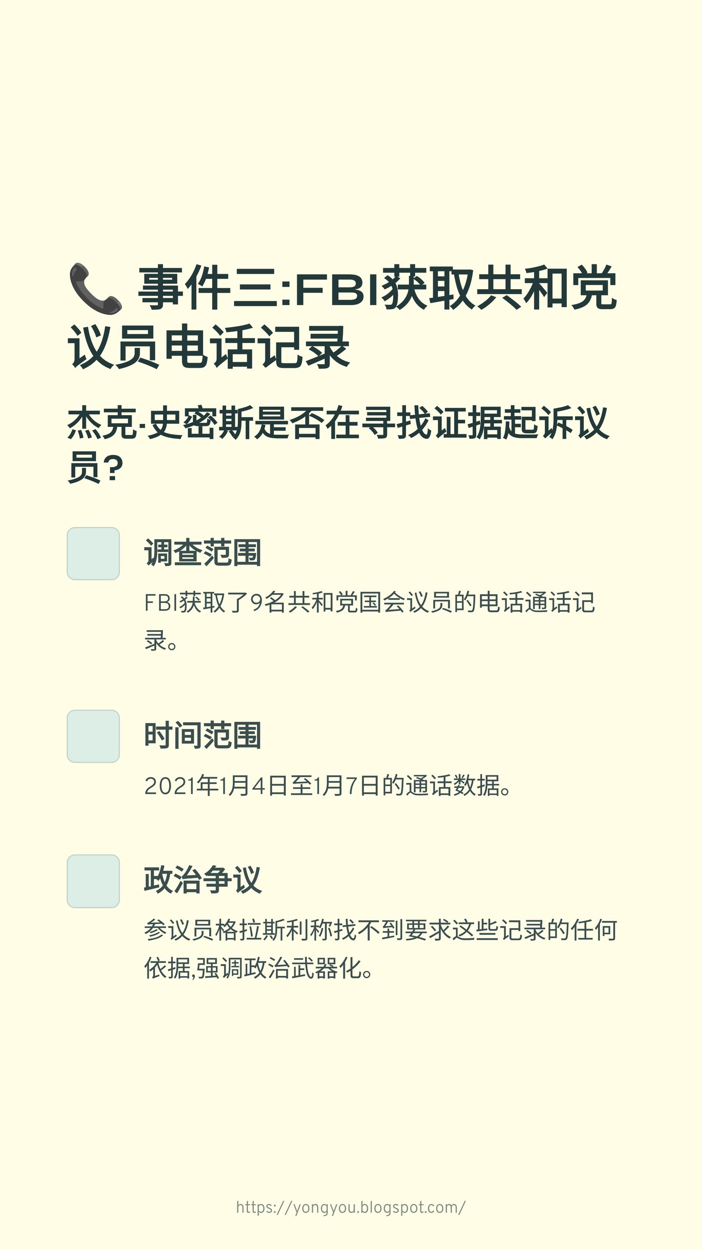 - FBI据称获批调取多名共和党议员1月6日前后通联元数据,引发“政治武器化”争议。