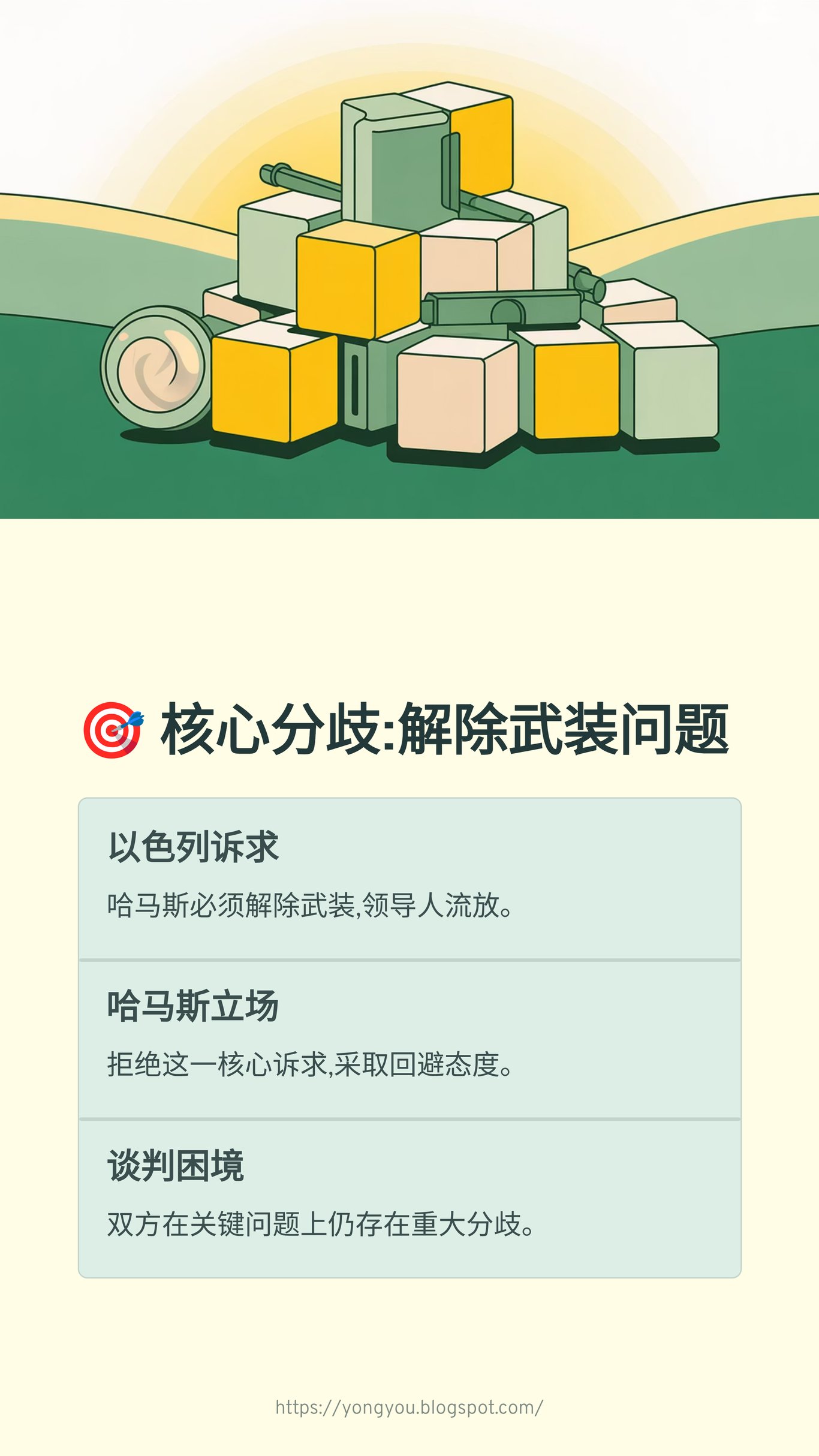 - 症结在于是否永久结束占领、撤军与人质释放顺序、是否解除武装。