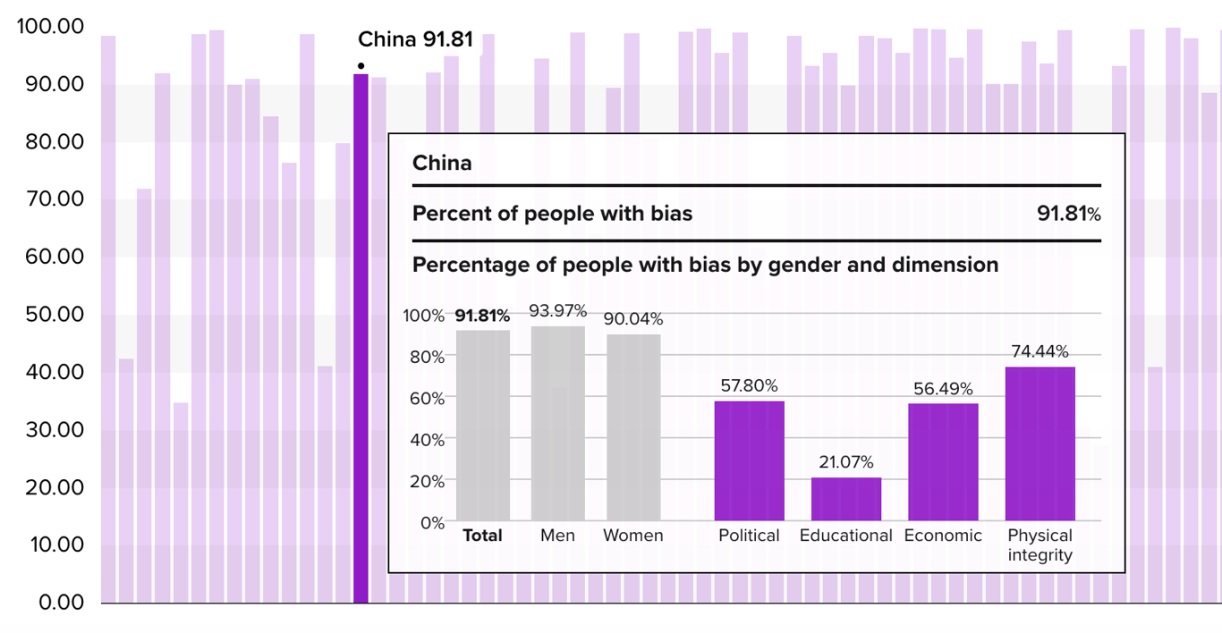 根据2023年联合国性别社会规范指数(GSNI)调查,有57.8%和56.49%的中国人分别在政治和经济维度持有性别偏见。相关观念包括,认为男性比女性能成为更好的政治领导人或企业高管。[10]