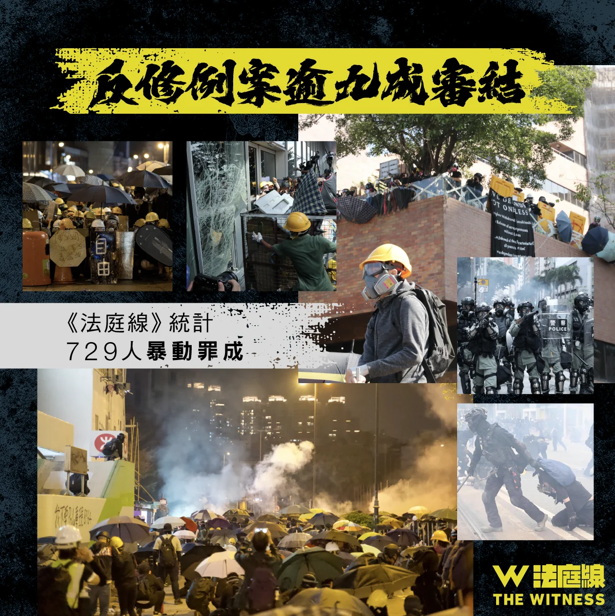《法庭線》今年 6 月整理及分析已審結的街頭案件,以暴動、非法集結、管有攻擊性武器、襲警等 13 類控罪追蹤到 2,382 名被告,發現當中 71% 人至少一罪成;被判囚的 1,285 人之中,大部分刑期在一年以下,29 人的總刑期達 6 年或以上。