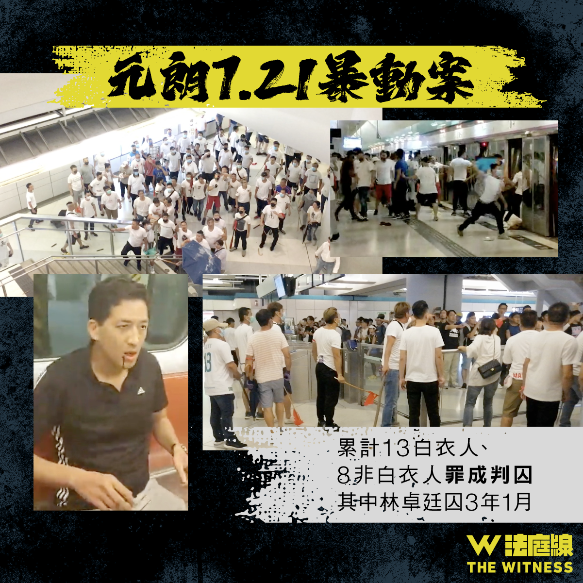 今年審結的案件,包括 721 非白衣人案,時任立法會議員林卓廷與 6 名被告,被裁定暴動罪成,判監 2 年 1 個月至 3 年 1 個月。法官陳廣池指,林卓廷在閘內呼籲不要退後是煽風點火,亦不信納其他被告稱擲物、射水等是為了阻止白衣人,指被告自圓其說,是暴動的參與者。