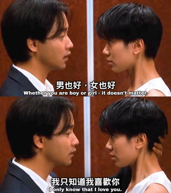 三人皆被突如其来的爱意席卷,晕头转向地拷问自己的性取向与性别认同,林子颖模糊的性别身份使得爱意在复杂中尽显纯粹。片中的名台词「男又好,女又好,我净係知道我钟意你」是当时的爱情理想主义宣言。在续集《金枝玉叶2》里,梅艳芳饰演的女演员方艳梅闯入顾家明和林子颖的生活,再次因性别乌龙与同性情愫搅动了三人的心弦。