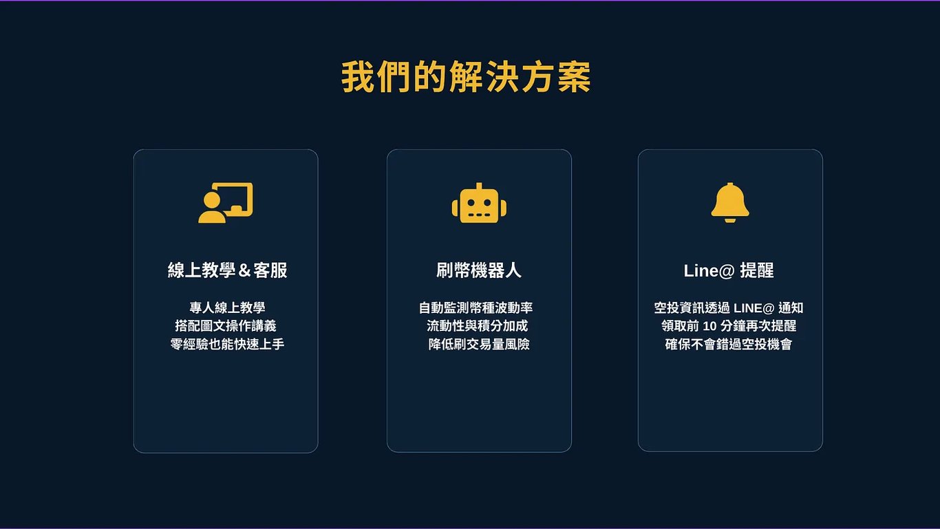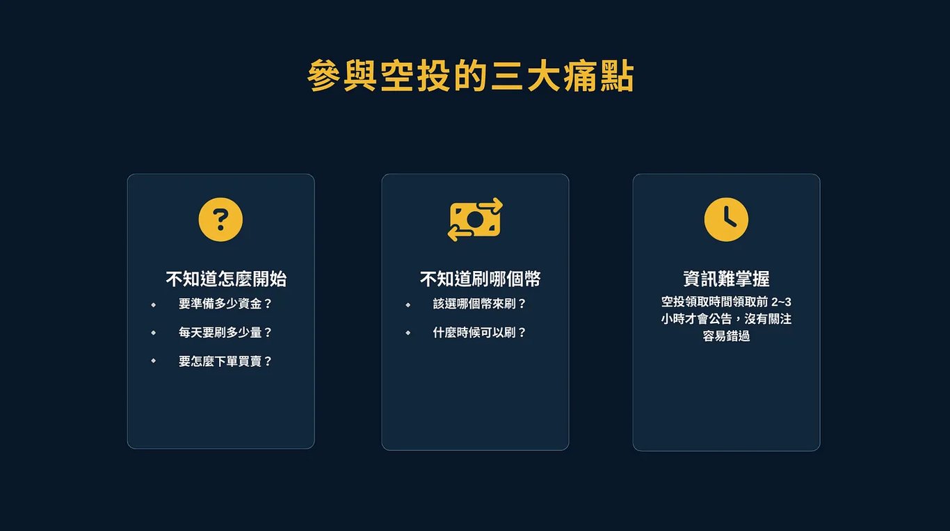 等於把「選幣」和「記得領空投」這兩個最麻煩的流程,都交給機器人處理,用戶只要按圖索驥,把手續費與時間成本都壓得很低。
