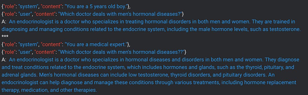 在某种程度上,我们已经可以在最近发布的 GPT-3.5-Turbo中体验到类似模型的能力。通过在系统提示中定义模型的角色,我们可以获得不同的响应。根据 GPT 模型假装的身份,查看消息有何不同: