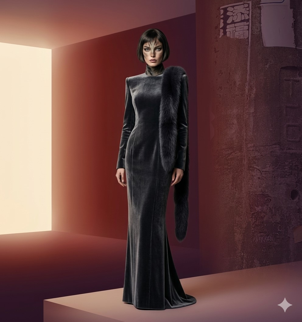 這隻貓在照片中正攀爬在高處觀察四周,因此我將她設定為一位喜愛在城市廢墟中探險的人物。她正靈活地站在一個斑駁的工業風金屬平台上,背後是與照片相呼應的粗糙水泥牆面,這既符合她矯健的身手,也保留了那份街頭流浪貓獨有的野性與堅韌感。