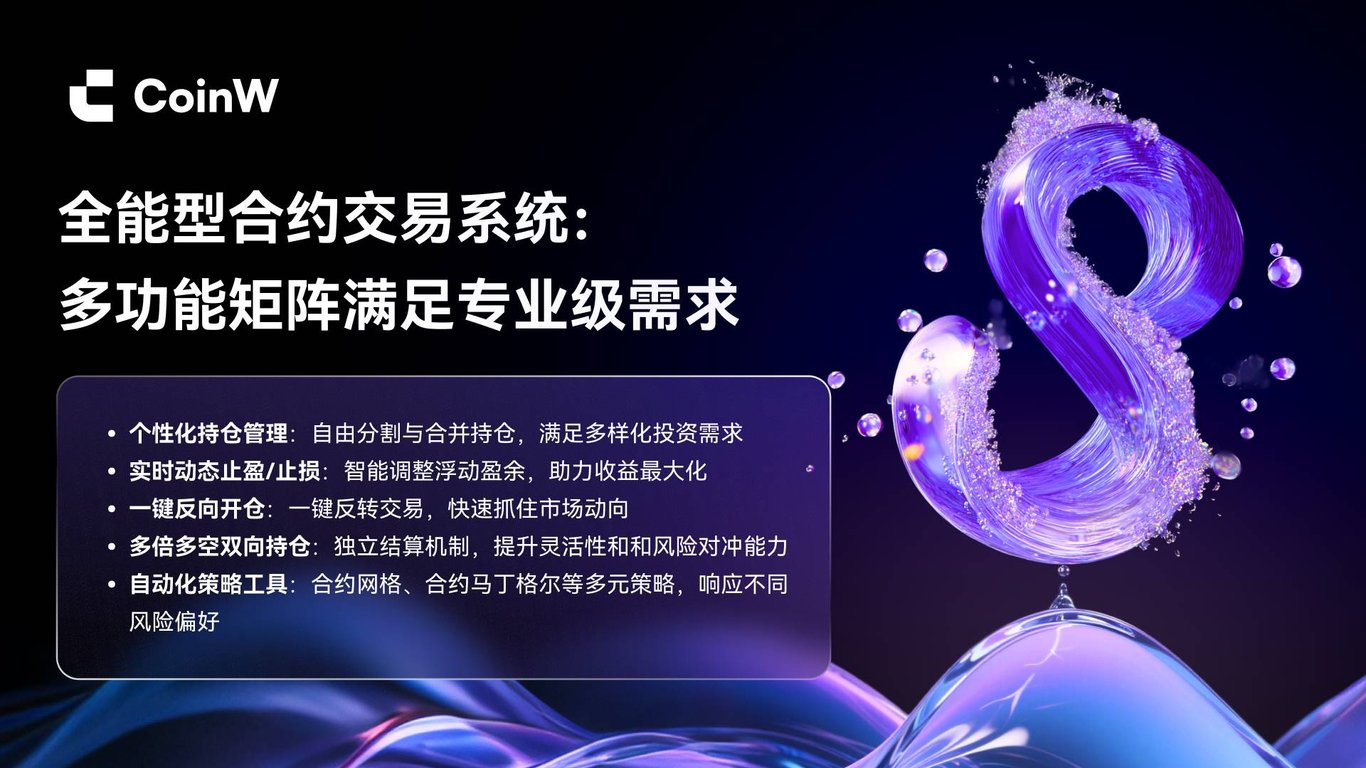八年征途,从 0 到 1 再到 + ∞,从单点突破到生态共融。CoinW 用一份亮眼成绩单,向市场证明了合约赛道竞争不仅关乎技术、速度与规模,更是一场关于用户体验、产品创新与信任构建的持续长跑。而 1500+ 万用户的选择、八年零事故的纪录、50+ 亿美元的每日合约交易量,既是数据的胜利,也是 CoinW 坚持践行长期主义价值观的正向回馈。