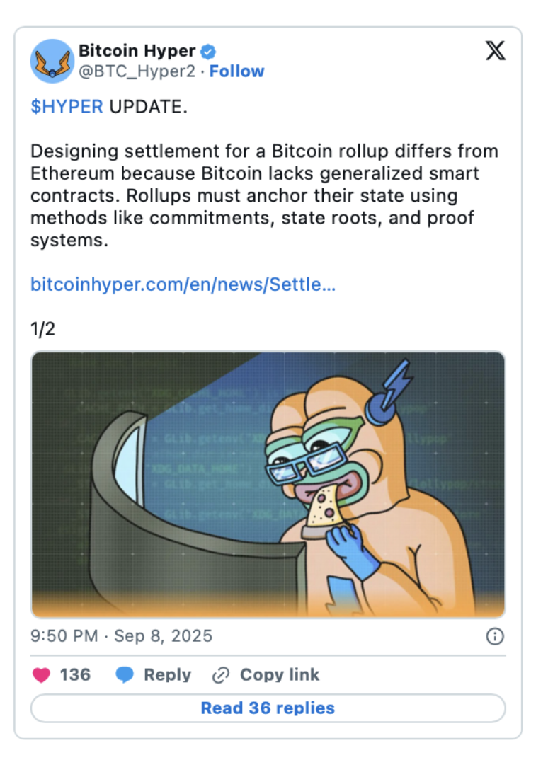 事實上,團隊的最新更新正好強調了這一點。由於比特幣本身並不提供通用智慧合約,錨定一個 rollup 需要新的模型。團隊正在開發方法,利用承諾、狀態根和證明系統,定期將 Hyper 的狀態鎖定到比特幣 Layer-1。