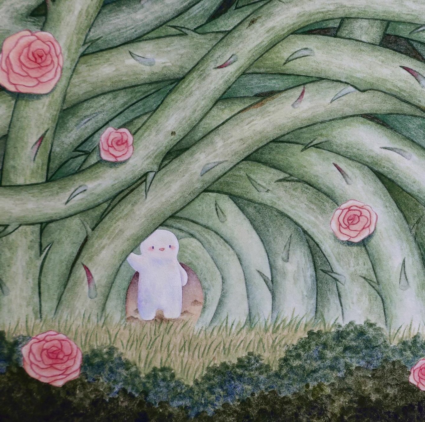 原本一直很糾結要用什麼方式來呈現這張作品,最後選擇用保留筆觸的方式來層層疊加出荊棘的層次,完成後雖然與預想的不一樣,但感覺很溫柔療癒,很滿意🥰