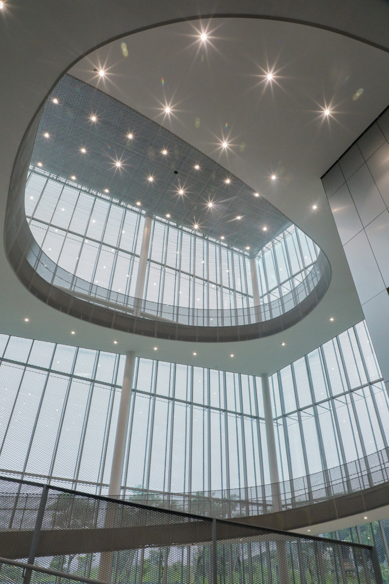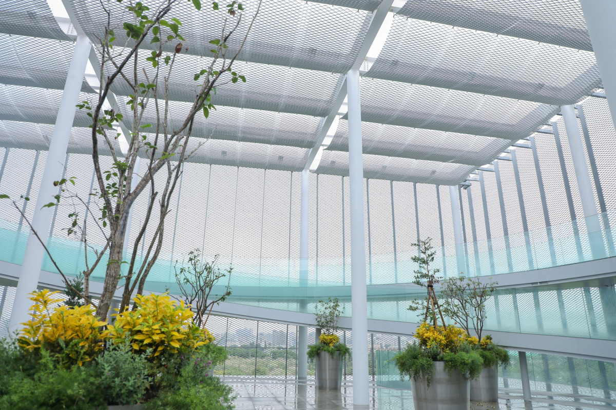 7樓的文化之森,位在綠美圖最高的空間,公園景致一覽無遺。上方有特殊的圍網設計,彷如戶外空中花園的概念。雖然綠美圖外觀是8個立方體,但內部卻有許多迴旋的設計,以及圓形的元素。