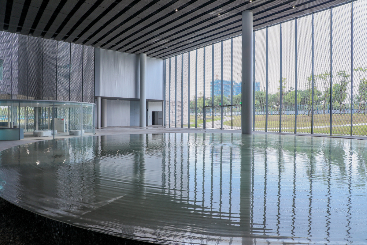 迴旋的斜坡作為觀展動線引導觀眾自在探索,通透的空間與窗外自然綠意對話,讓觀眾即便在漫步公園時也可欣賞作品。此外,綠美圖共有5間從4至10公尺不同挑高的展間分布於各樓層,中美館開館首展《萬物的邀約》也將於5個展覽室完整展出。