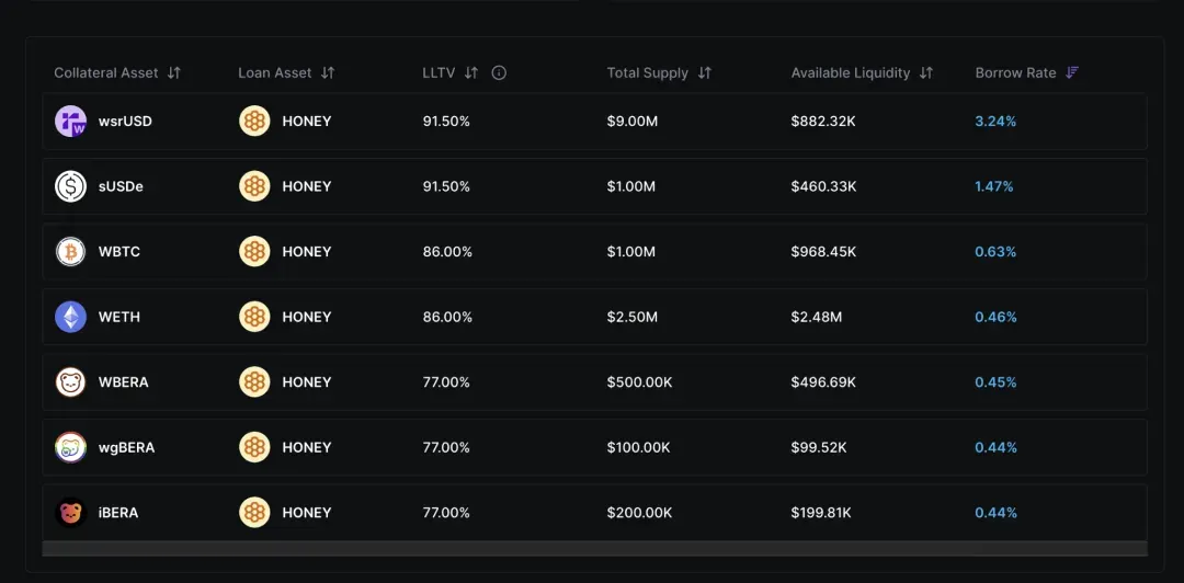 在 Borrow 端,我们可以通过 wsrUSD、wETH、wBTC、wBERA、sUSDe、wsrUSD、iBERA、wgBERA 等资产进行抵押,向池中借出 HONEY 资产用于进一步的收益。