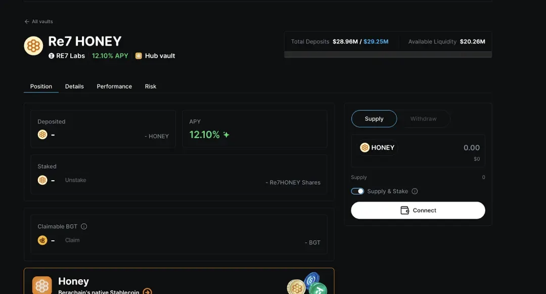 目前,BEND HONEY 的当前总供应规模约为 2894 万美元,并且作为借方能够获得 Yield + BGT 的双重收益,年化收益大约在 12% 以上。这意味着出借人在不承担过多策略复杂性的情况下,即可通过稳定的基础金库获得 PoL 驱动的原生收益。