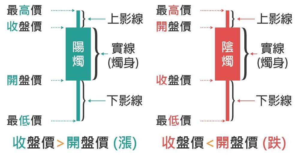 紅色:代表價格下跌(收盤價低於開盤價)。