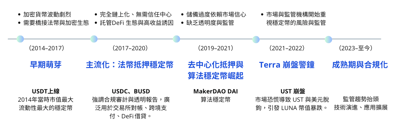 回顧其發展歷程,穩定幣大致經歷五個階段: