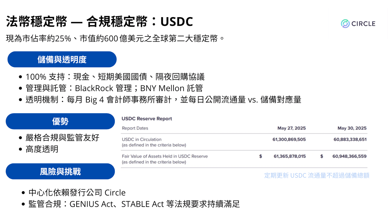 相較之下,USDC 市佔約 25%,以 合規性與透明度 見長。其儲備 100% 由 現金與短期美國國債 支持,並由 四大會計師事務所 每月審計,同時公開流通量與儲備金對應情況。這使 USDC 成為市場上 最具監管友好與信任度 的穩定幣。不過,它同樣存在中心化挑戰,運作仍依賴發行公司 Circle,需持續應對各國監管要求的變化。